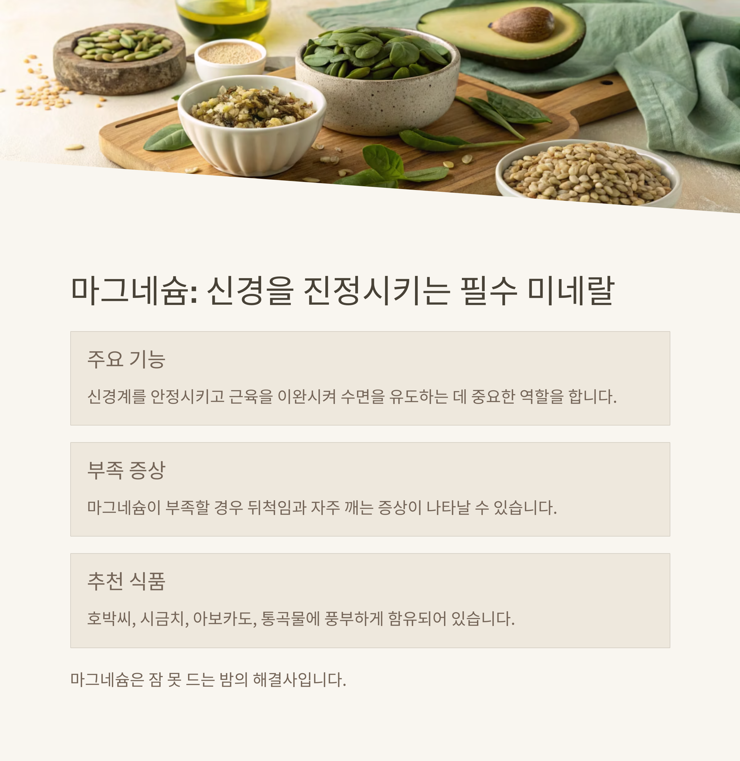 마그네슘은 신경계를 안정시키고 근육을 이완시켜 수면을 유도하는 데 중요한 역할을 합니다.