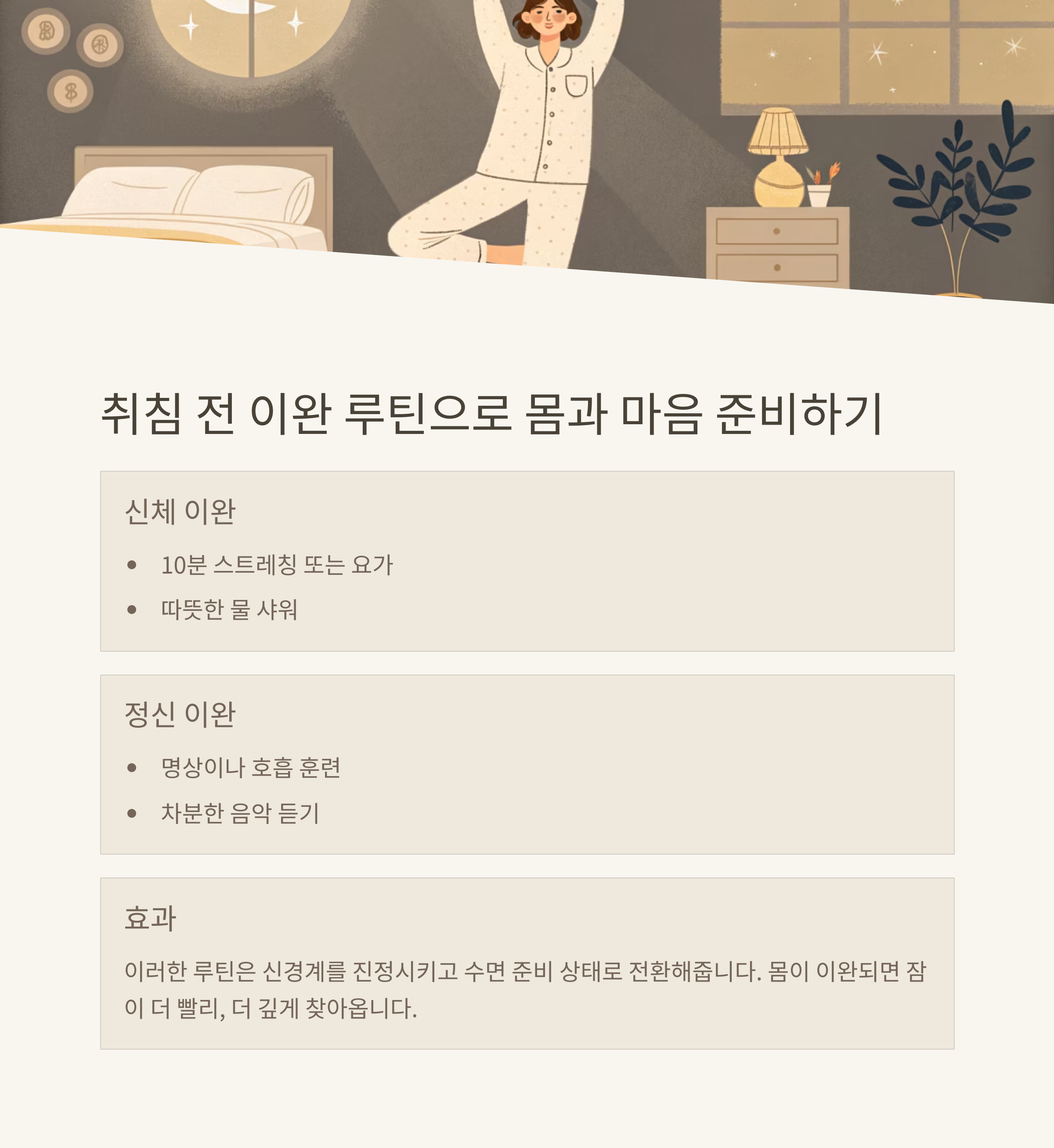이러한 루틴은 신경계를 진정시키고 수면 준비 상태로 전환해줍니다.