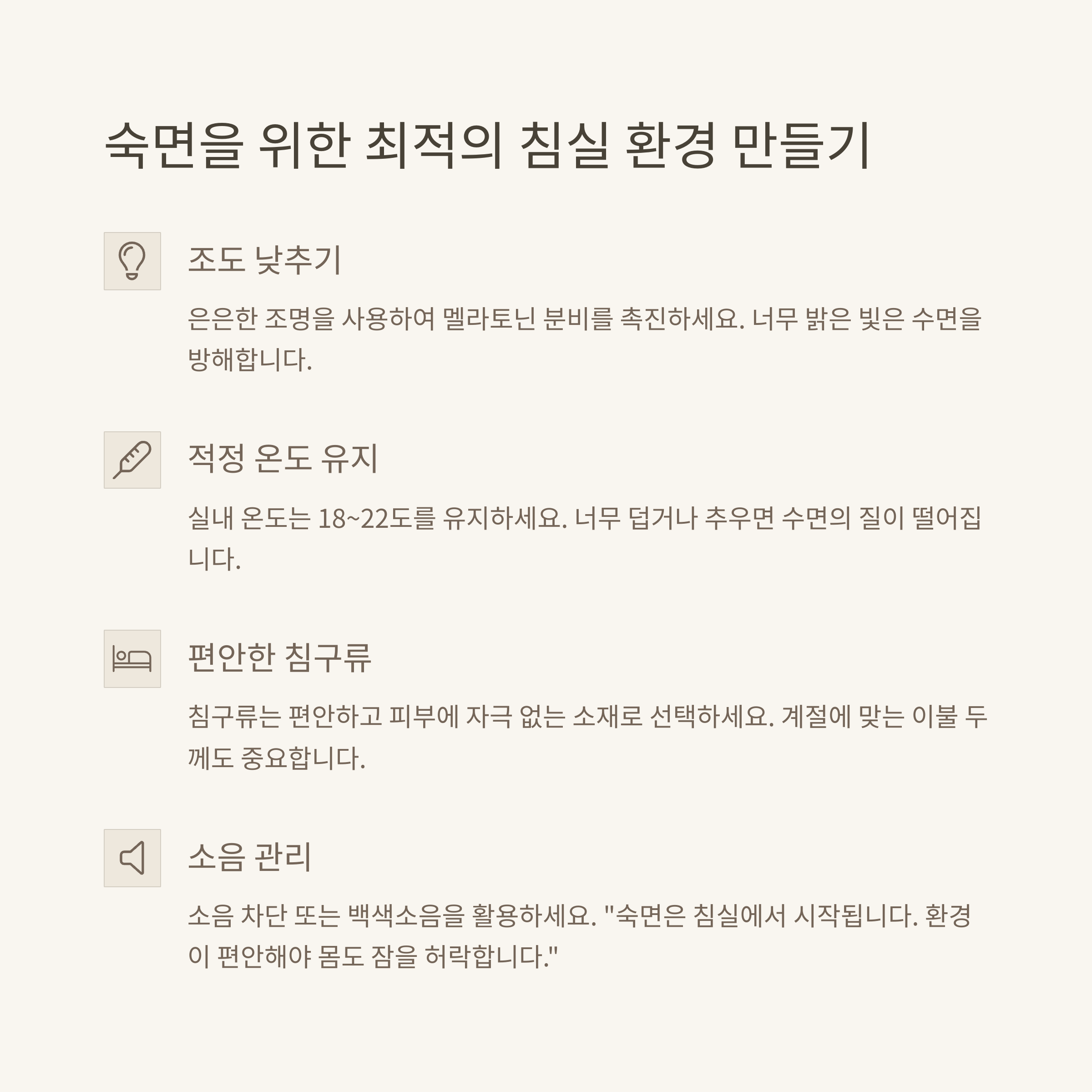 "숙면은 침실에서 시작됩니다. 환경이 편안해야 몸도 잠을 허락합니다."