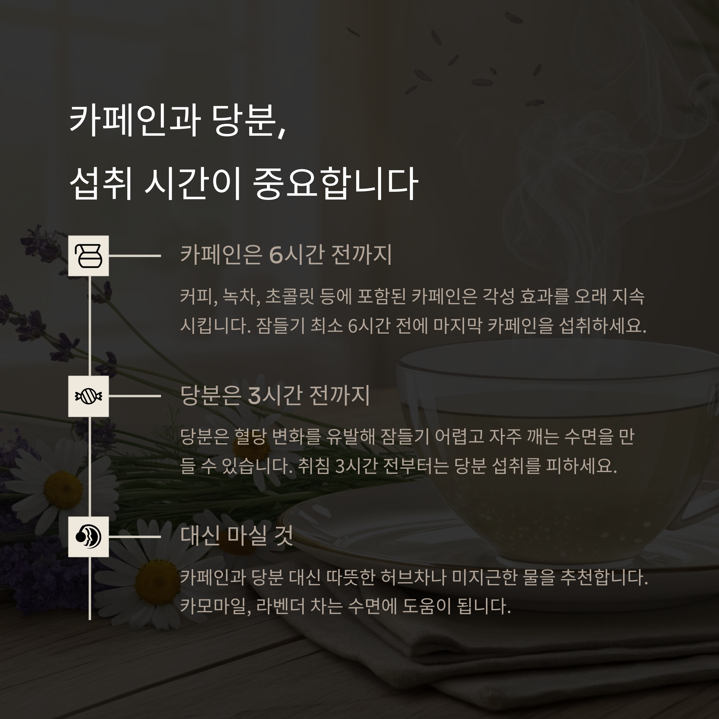 카페인은 최소 잠자기 6시간 전, 당류는 3시간 전 이후 피하는 것이 좋습니다.